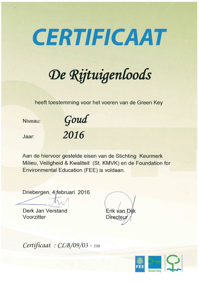 Duurzaamheid speelt al jaren een belangrijke rol binnen de bedrijfsvoering van De Rijtuigenloods. Na de jaarlijkse herkeuring mochten zij voor het zesde jaar op rij het Gouden Green Key keurmerk in ontvangst nemen.