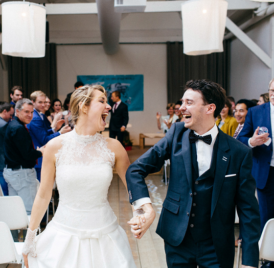 Het stel gaf hun huwelijksdag een sterk persoonlijk karakter. ,,Dat begon al bij de locatie, die net als ons interieur thuis een industriële uitstraling heeft”, vertelt Patricia. ,,Ook de ceremonie was persoonlijk. Niet alleen de ambtenaar deed het woord, maar ook onze ouders en getuigen. Dat maakte dat er wel wat tranen van geluk vloeiden en dat we flink gelachen hebben.” De aanwezige familieleden en vrienden zagen het stel pas voor het eerst tijdens de ceremonie in Het Centraal Ketelhuis. De daggasten verrasten op hun beurt ook het bruidspaar. Ze hadden namelijk een trouwschilder geregeld, die de ceremonie op doek vastlegde. ,,Dat schilderij hangt nu boven de bank. Een heel speciale herinnering aan onze bruiloft.”