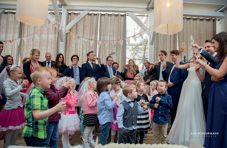 Het jonge stel vertrok na de huwelijksceremonie in het stadhuis van Harderwijk naar de Wagenwerkplaats in Amersfoort. Daar stonden de kleuters uit de klas van juf Lianne al klaar met een mooie boog. “Super leuk natuurlijk. We hebben met de daggasten en de kinderen taart gegeten en getoost in Het Oude Magazijn.”
